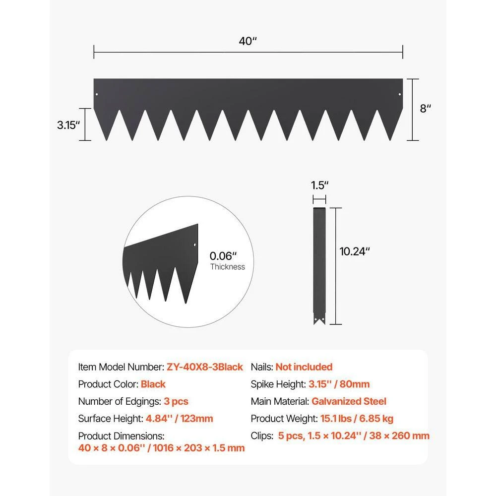 - Various sizes: VEVOR steel landscape edging is available in a set of 3-pieces, each measuring 40 in. x 8 in., it comes with 5 clips for effortless installation, the extended spikes make secure ground anchoring, allowing you to create clean lines and spaces in your lawn. Loved by gardening enthusiasts