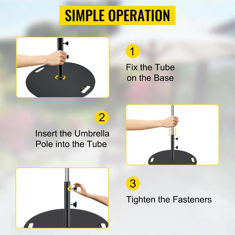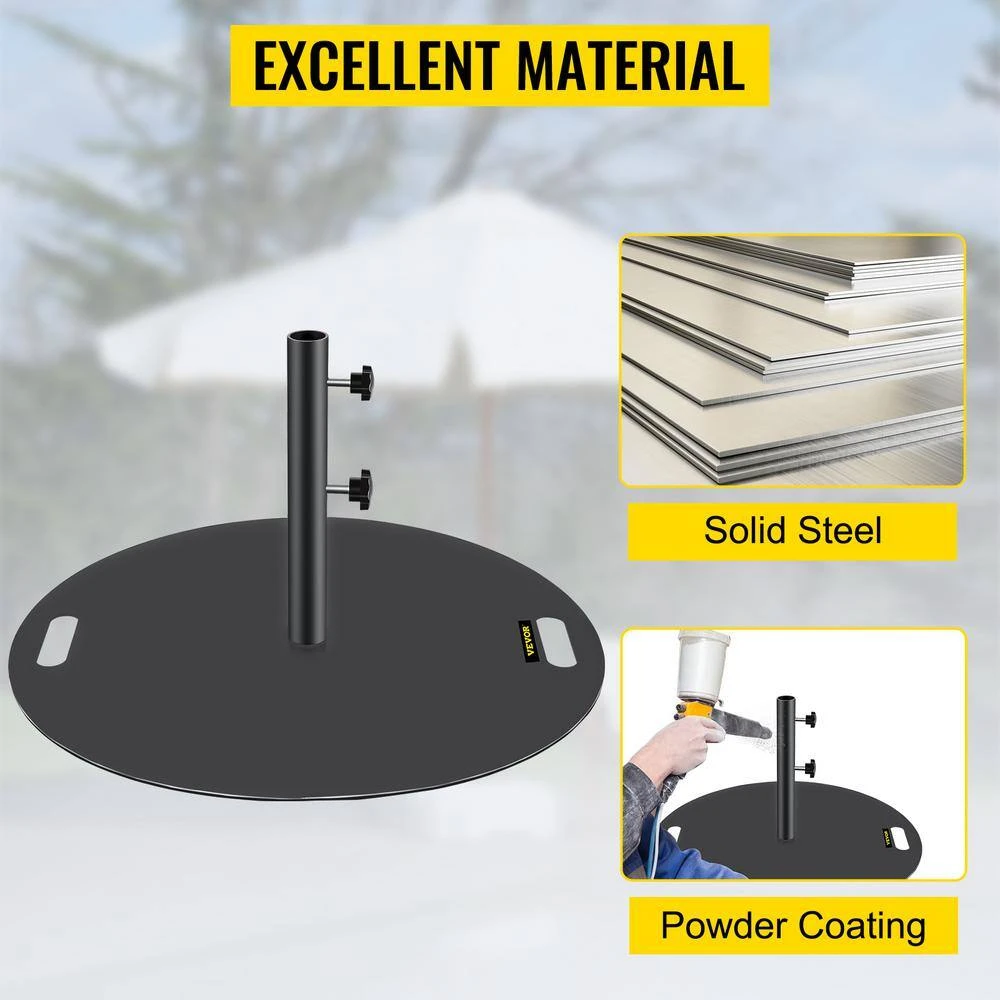 The VEVOR 27 in. round umbrella base is suitable for parasol pole, which can be fixed on deck and ground and used in shopping malls, courtyards and other places. The 1.5 in.-1.875 in. pole can be fixed with this umbrella base to ensure the stability of the umbrella and flat. High-quality material and powder coating provide the durability of the umbrella stand.