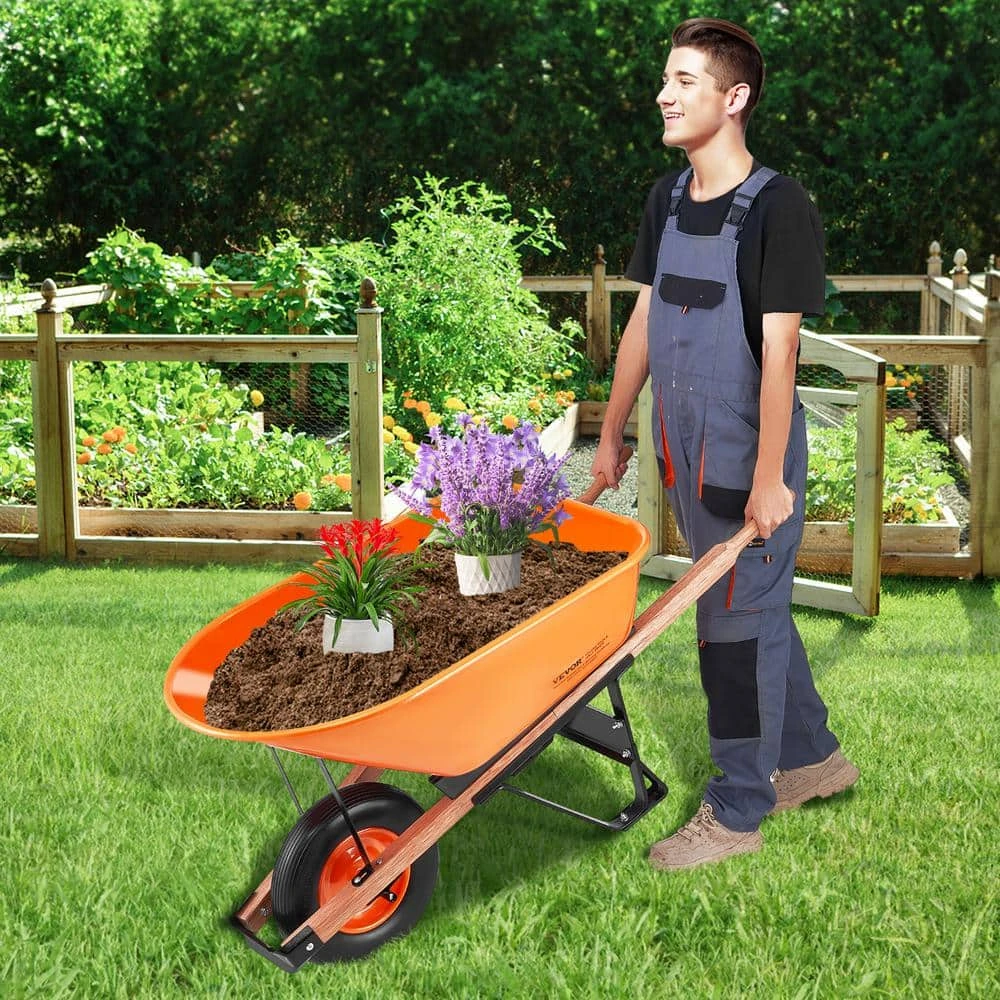 VEVOR 1-wheel garden cart: your gardening essential. This ergonomic garden cart features a padded handle and a 16 in. Wheel with deep treads for smooth, stable movement. Built with a sturdy metal frame and PU wheel, it’s perfect for transporting soil, gravel, etc. Easy to assemble with basic tools, this cart is your ideal gardening companion.
