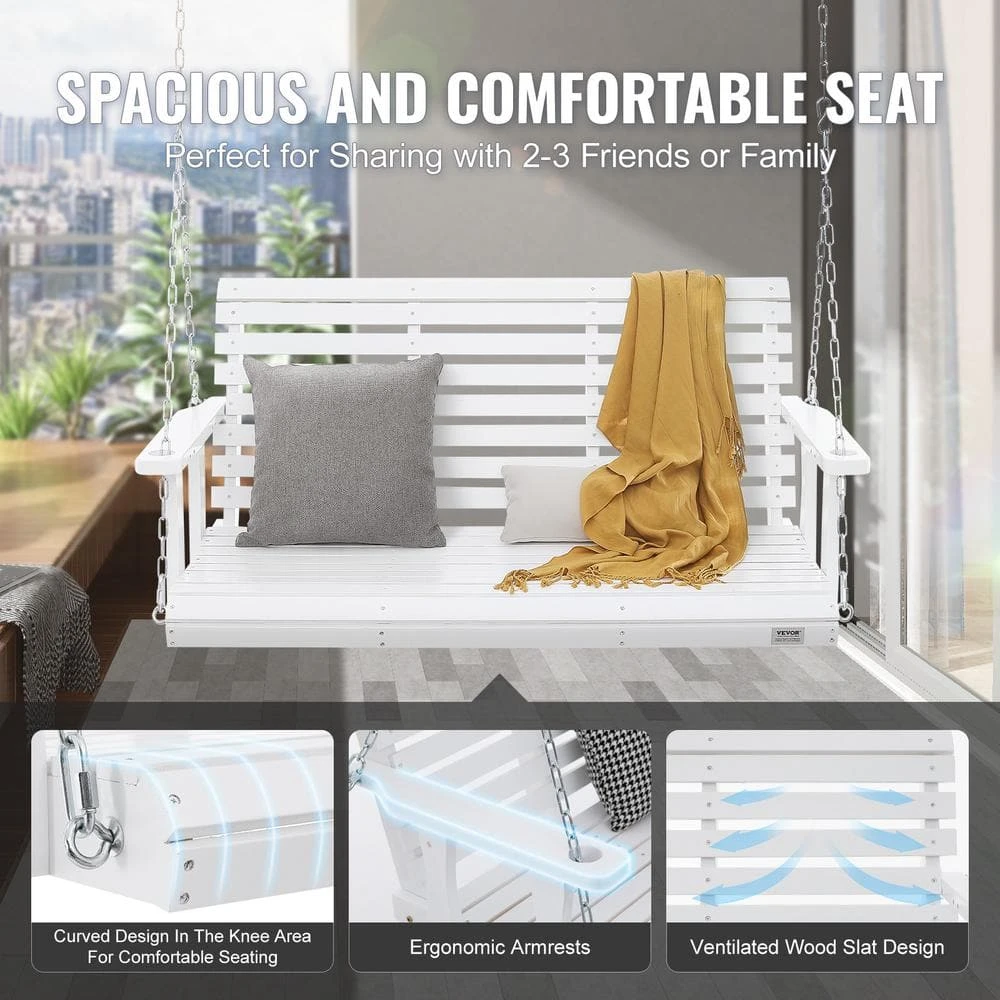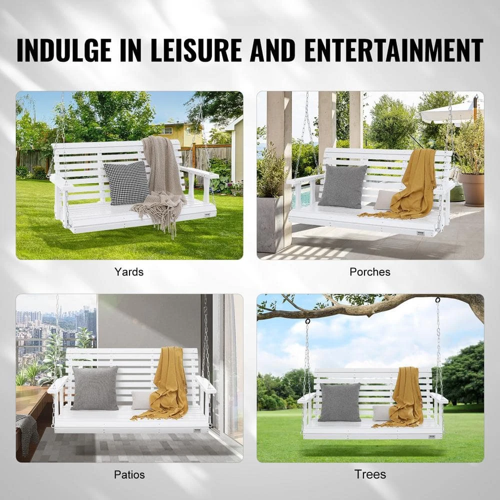 VEVOR Porch Swing: Experience Comfortable Leisure. Pure fir wood, triple PU paint coat for waterproofing, our porch swing is supported by steel chains for safety and stability. Easy installation with a variety of accessories allows you to quickly set it up in your yard, porch, or patio. Come and start your joyful journey.