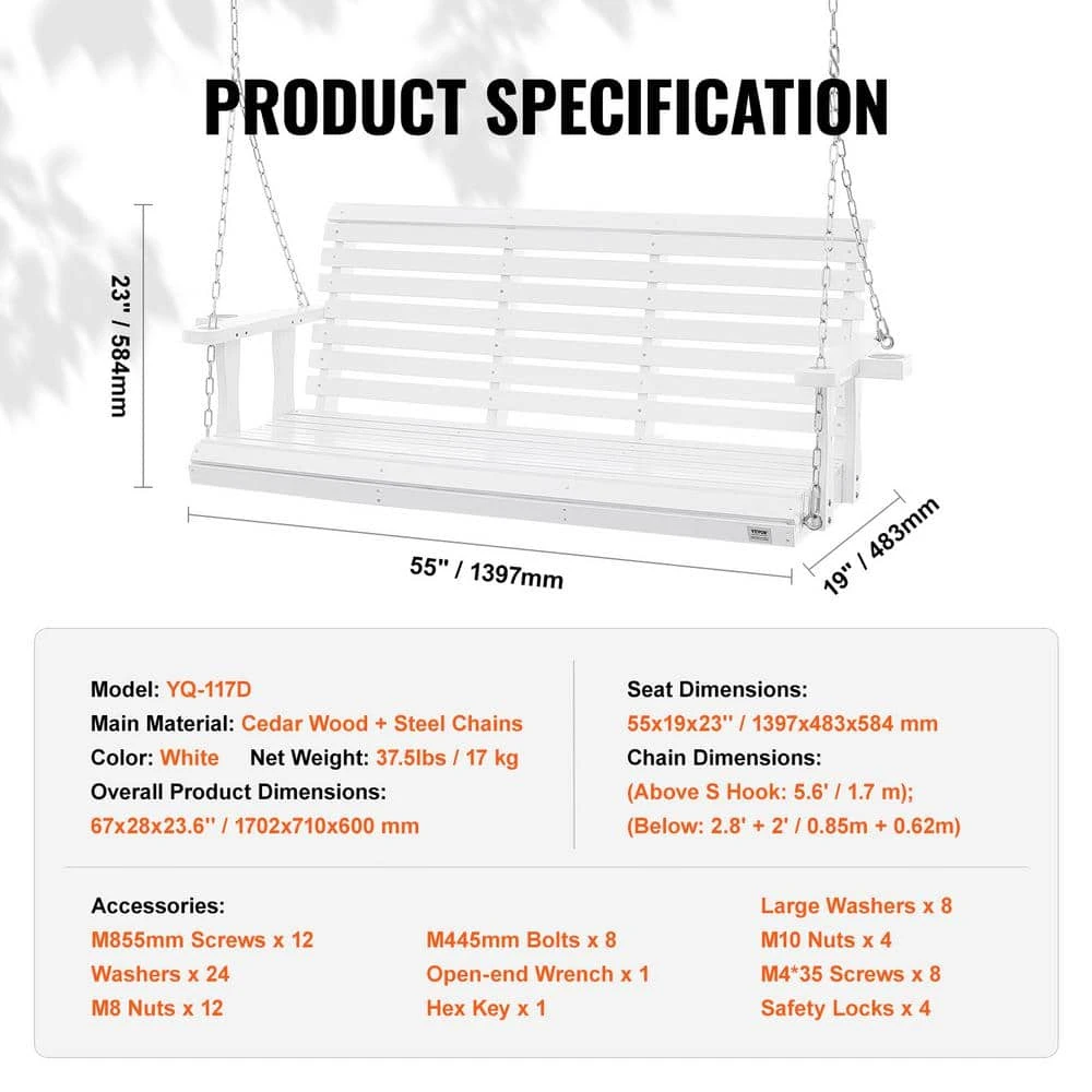 - Specifications: model: yq-117d, main material: cedar wood + steel chains, color: white, net weight: 37.5 lb. / 17 kg, overall product dimensions: 67 x 28 x 23.6 in. / 1702 x 710 x 600 mm, seat dimensions: 55x19x23 in. / 1397 x 483 x 584 mm, chain dimensions: (above s hook: 5.6 in. / 1.7 m); (below: 2.8 in. x 2 / 0.85 m x 2)